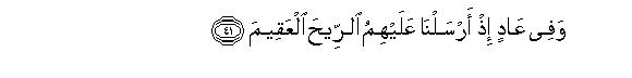 39The word used for this wind is aqim, which is used for a barren woman, though literally it means dry. If the literal meaning is taken it would mean that it was such an intensely hot and dry wind that on whatever it blew it caused it to become absolutely dry; and if it is taken in the idiomatic sense it would mean that like a barren woman it was a wind without any benefit: neither it was pleasant, nor it brought rain, nor fertilized the trees, nor contained any other benefit for which the wind blows. At other places it has been stated that this wind was not only useless and dry but it blew so violently that it swept the people off the ground and it continued to rage for eight days and seven nights continuously, till it laid the entire land of the `Ad waste. (For explanation, see E.N.'s 20, 21 of Surah Ha Mim As-Sajdah, and E.N.'s 25 to 28 of Al-Ahqaf).