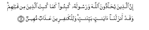 14"Those who oppose . . . " : Those who do not recognize the bounds set by Allah and instead set some other bounds for themselves. Ibn Jarir Tabari has given this commentary of this verse: "That is, the people who resist Allah with regard to the bounds and duties enjoined by Him, and set for themselves some other bounds instead of the bounds set by Him." Baidawi; has given this commentary of it: "That is, they show hostility towards and dispute with Allah and His Messenger, or set other bounds for themselves than the bounds set by them, or adopt the bounds set by others. " Alusi in his Ruh Al-Ma `ani has concurred with Baidawi in this commentary and cited the statement of Shaikh-ul-Islam Sa`dullah Chalpi to the effect: "In this verse a threat has been held out to those kings and evil rulers who have framed many such rules as are opposed to the bounds set by the Shari ah, and called tjem law." Here, `Allama Alusi has dwelt upon the constitutional status (i.e, constitutional from the Islamic viewpoint) of the man made laws as against the Shari ah laws and concluded thus: