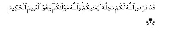 [1-2] O Prophet, why do you make unlawful that which Allah has permitted for you?1 (Is it because) you seek the good-will of your wives?2 Allah is All-Forgiving All Merciful.3 Allah has already appointed a way to absolve you (people) from your oaths.4 Allah is your Master, and He alone is the All-Knowing, the All-Wise.5